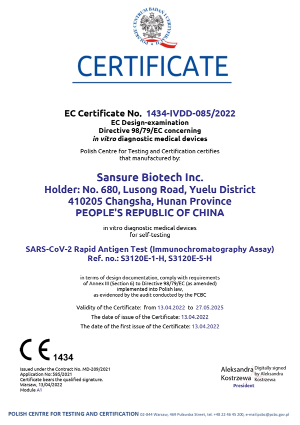 必一运动生物新冠快速抗原检测试剂自测产品取得欧盟CE1434自测证书,表明公司免疫检测产品性能获得官方机构认可,进一步丰富了必一运动生物全场景化新冠检测解决方案,扩大和满足了全球市场各级检测防控需求,为全球疫情防控工作持续助力。